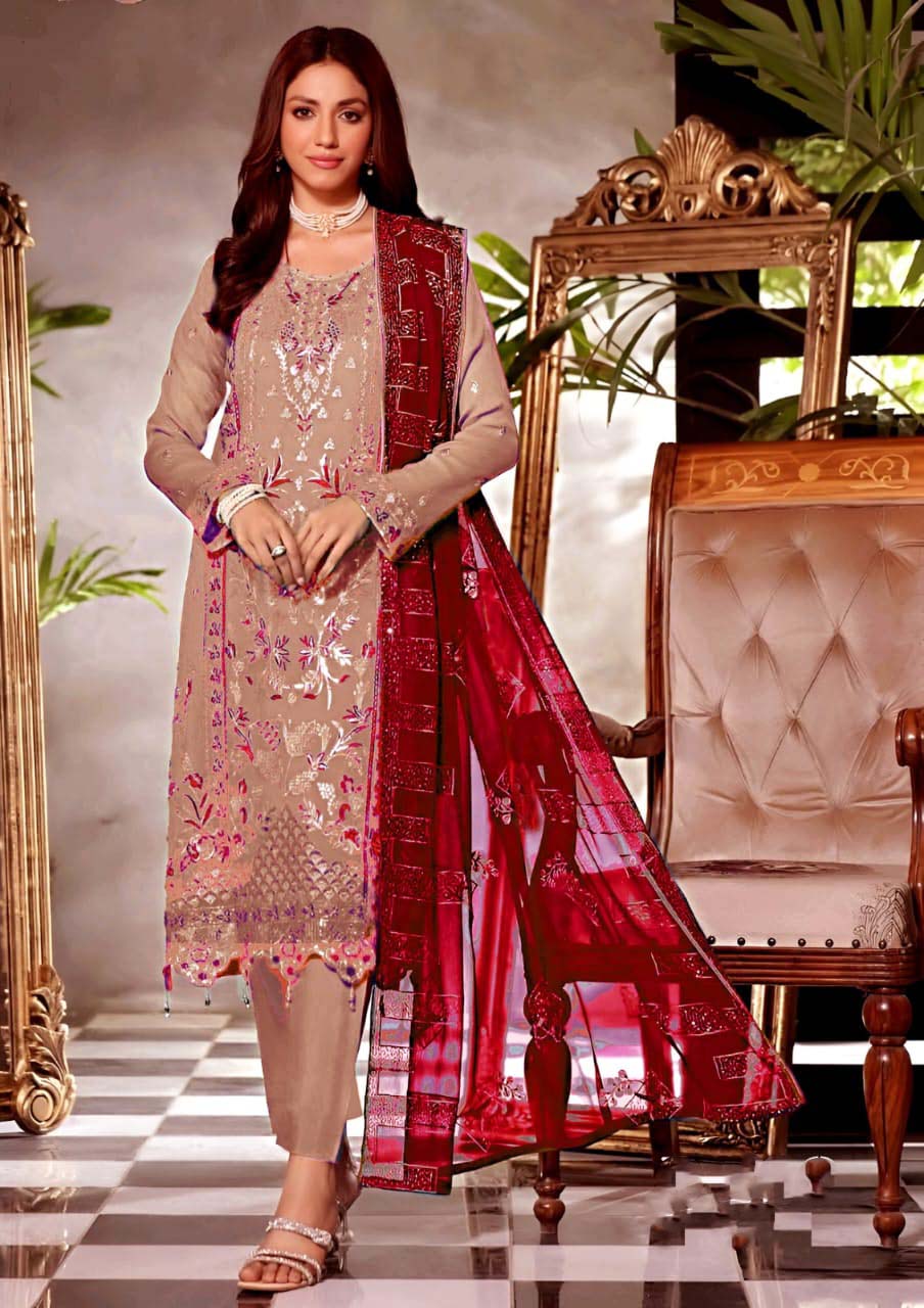 This outfit blends modern sophistication with traditional craftsmanship. The combination of beige and purple is eye-catching yet graceful — ideal for women who appreciate refined fashion with a hint of boldness.