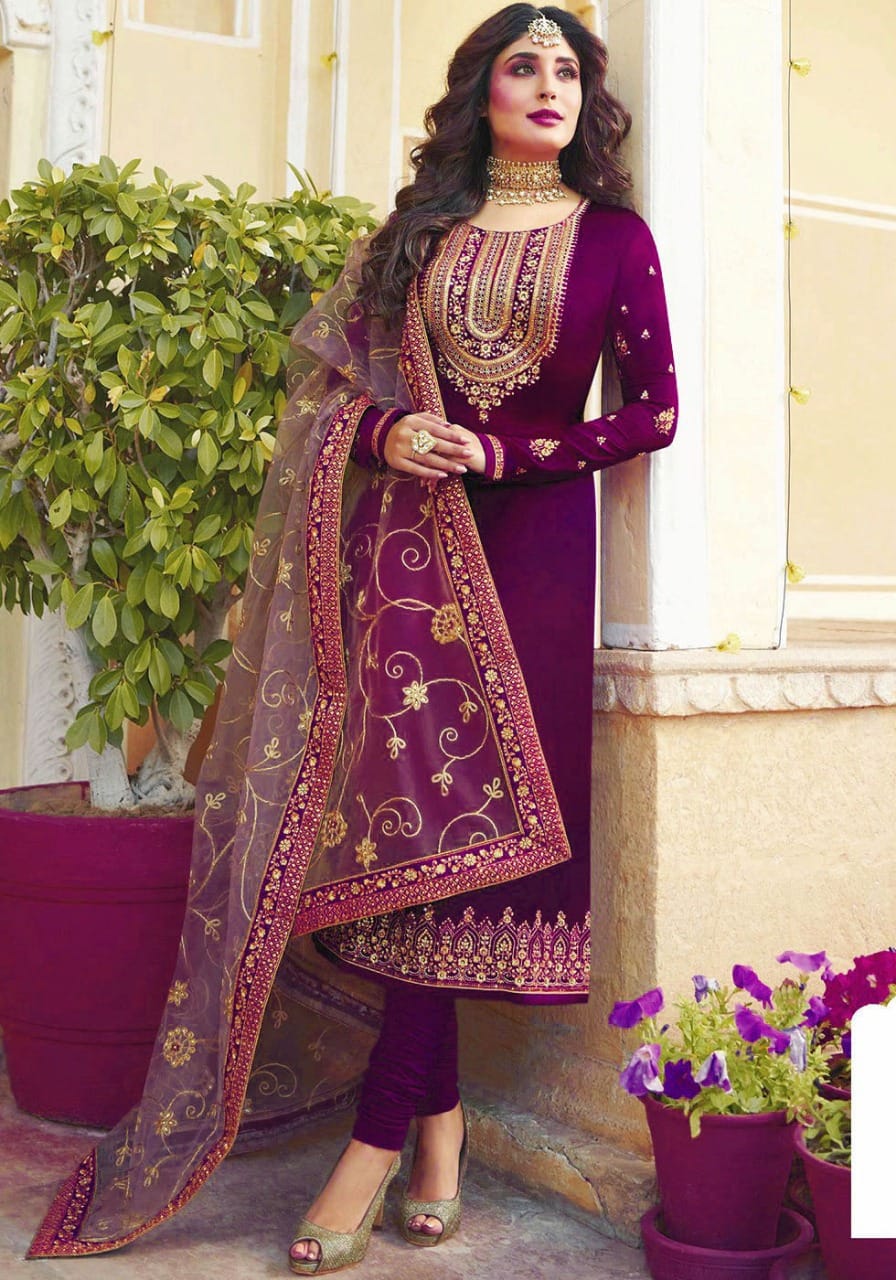 A straight-cut kameez with churidar pants and a heavily embroidered dupatta, offering a graceful and royal silhouette.
