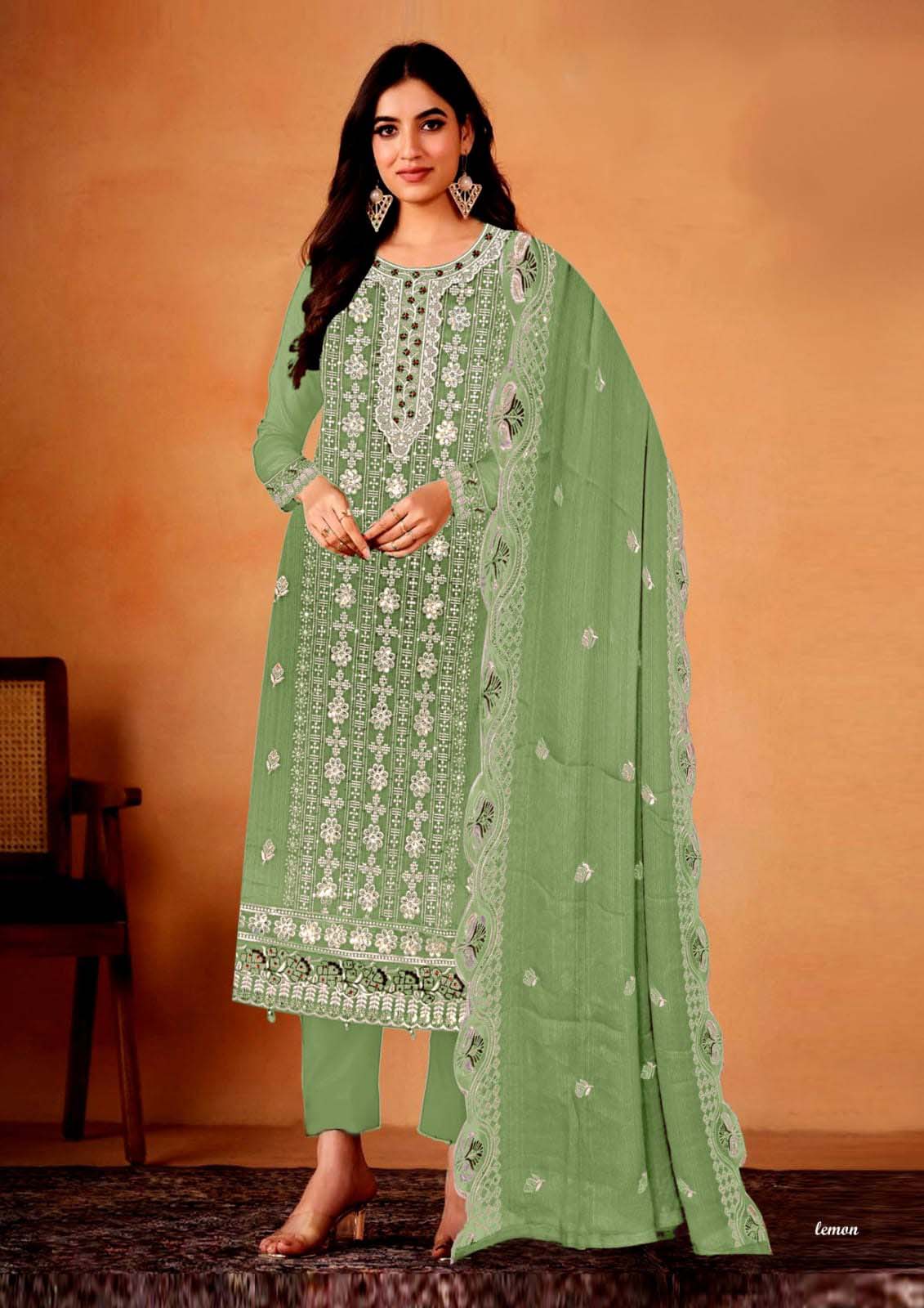 The hemline and sleeves have coordinated embroidery, maintaining a consistent and intricate design theme.