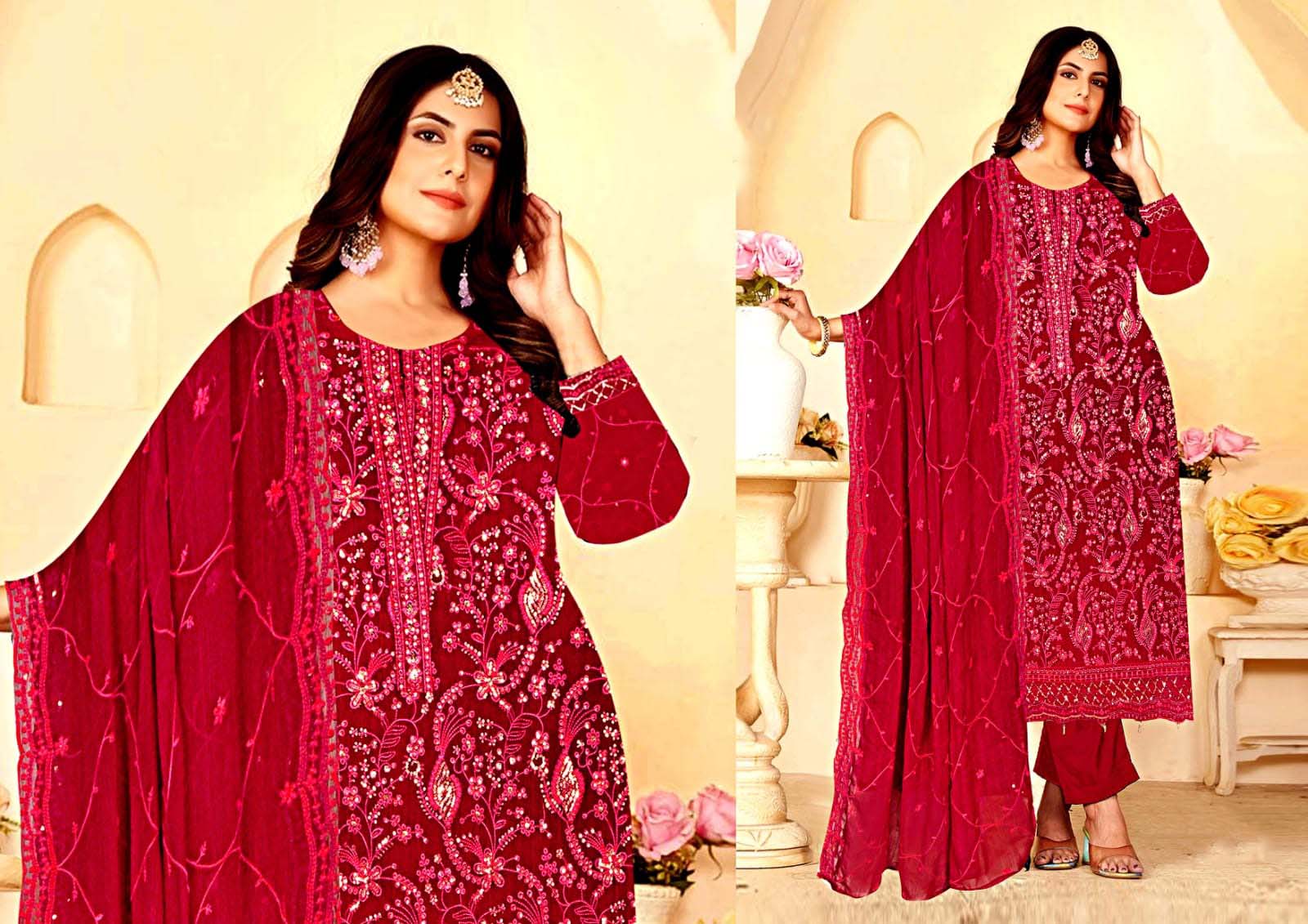 Bottoms: Plain, matching maroon straight trousers or churidar that balance the ornate top.