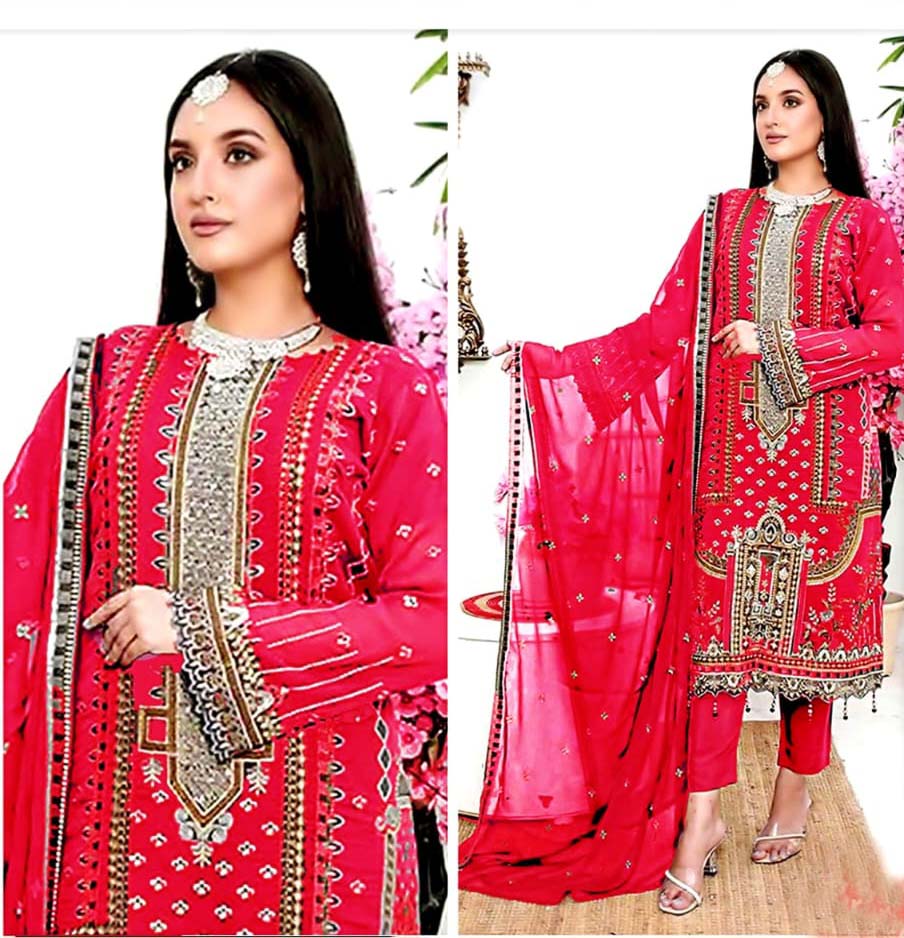 The simplicity of the pants balances the ornate kameez, maintaining harmony in the design.